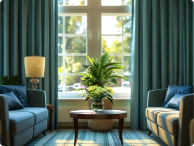 Rất khuyến khích sử dụng rèm hai lớp (một lớp voan, một lớp vải cản sáng). Hệ rèm này mang lại sự linh hoạt tối đa, vừa đảm bảo sự riêng tư, vừa cho phép điều chỉnh ánh sáng một cách mềm mại, phù hợp với mọi thời điểm trong ngày.