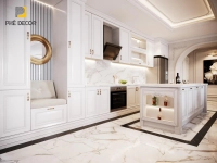 Là sự giao thoa tinh tế giữa vẻ đẹp cổ điển và sự tiện nghi của hiện đại. Phong cách này giữ lại các đường nét đối xứng, các chi tiết phào chỉ nhẹ nhàng trên cánh tủ nhưng được tiết chế và đơn giản hóa. Màu sắc ưa chuộng là trắng, kem, xám nhạt kết hợp với các chi tiết tay nắm hoặc vòi nước mạ vàng, đồng để tăng vẻ sang trọng.