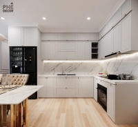 Tủ bếp không tay nắm (handleless) tạo ra một bề mặt phẳng liền mạch, tinh tế và dễ vệ sinh. Kết hợp với đó là các công nghệ thông minh được tích hợp khéo léo như sạc không dây trên mặt bàn, hệ thống chiếu sáng cảm biến, vòi nước cảm ứng và các thiết bị điều khiển bằng giọng nói.