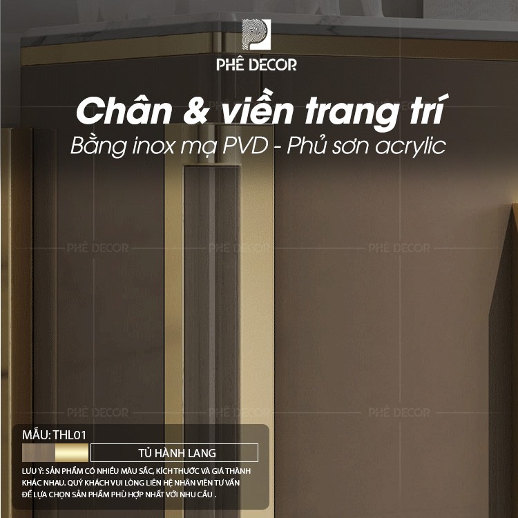 Chất liệu: Khung gỗ thông nhập khẩu Nga kết hợp gỗ polywood. Chân, viền trang trí, tay nắm cửa bằng inox mạ PVD. Phủ sơn acrylic